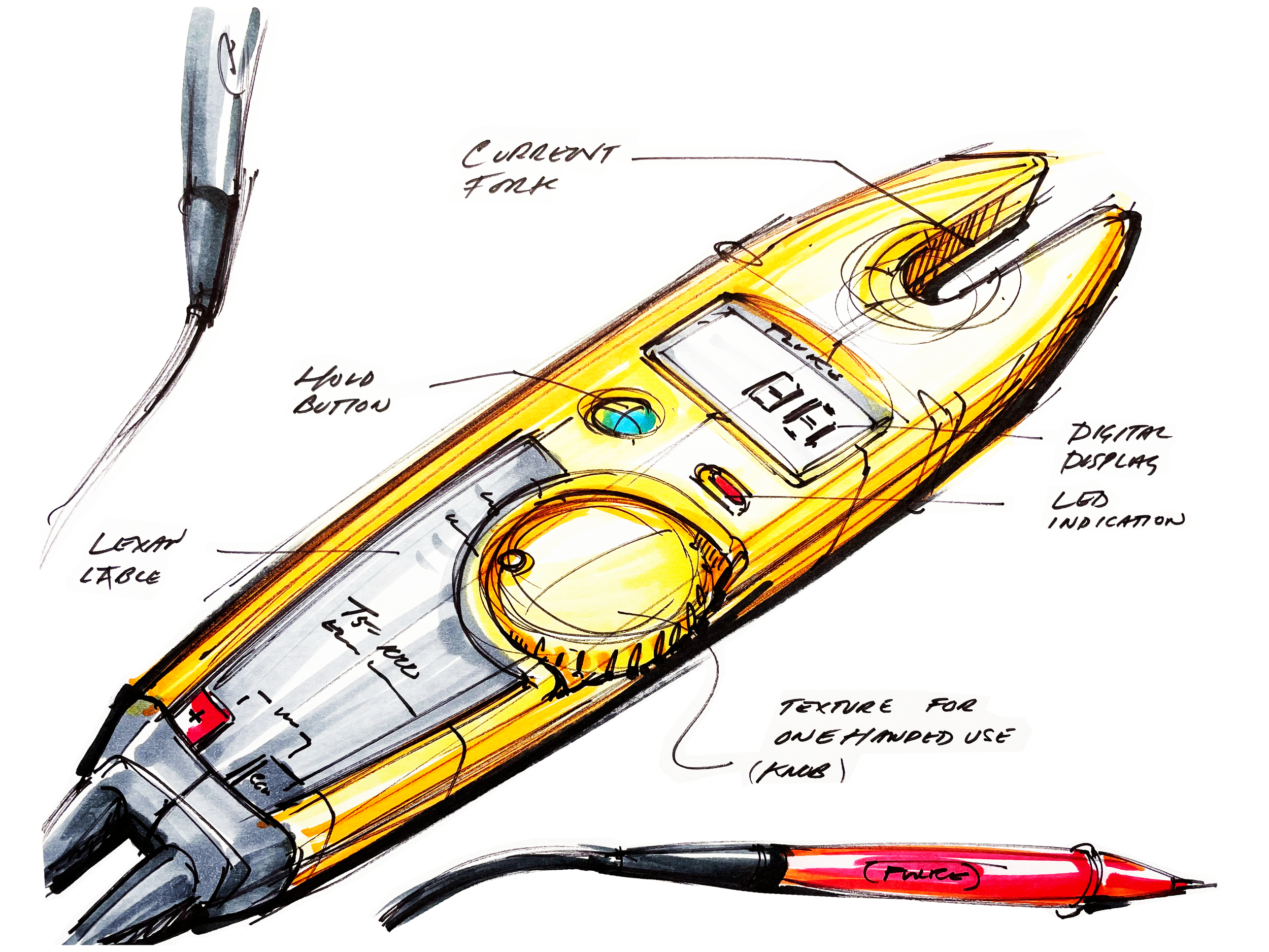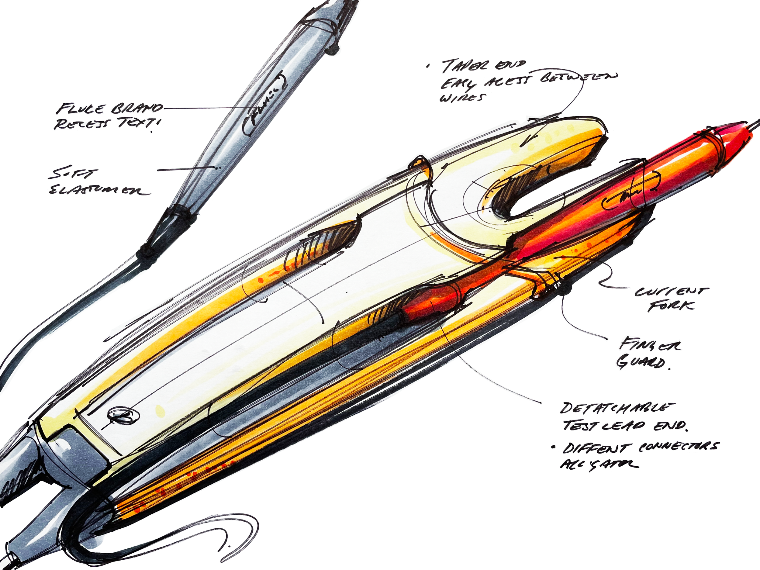 One handed operation was so important to this user. The user could store the test leads in the back and probe the circuits while holding the meter in one hand. With your thumb you could rotate the dial to change functions. The front u shaped fork was a new revolutionary way to measure current without a needing a clamp meter. The small detail bump near the end of the probe was visual and tactile way to warn users to stay back from the end of the probe to avoid a potential shock.